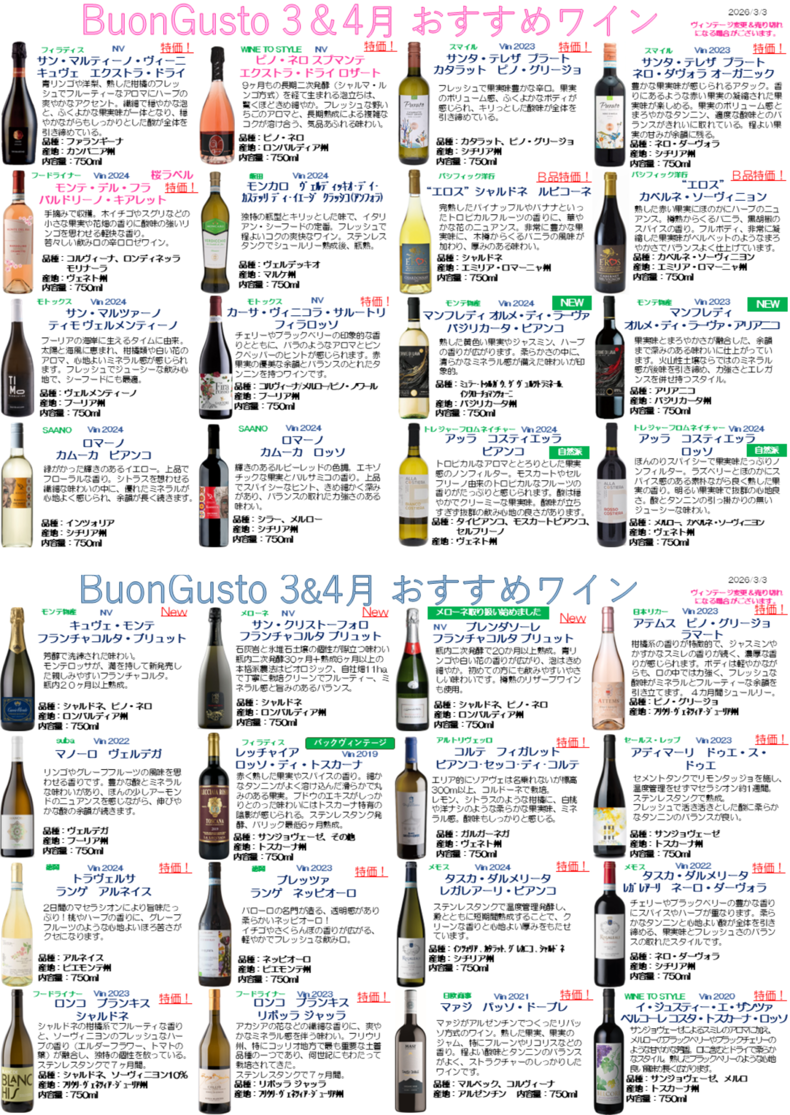 ブォングストがおすすめする2026年3月4月のおすすめワインです。【ソムリエ資格を持つスタッフや、イタリア業界のプロであるスタッフたちが自信をもってお勧めする、厳選ワインたち!数量限定アイテムも!チラシアイテムは特価でバラ1本よりご注文可能!】